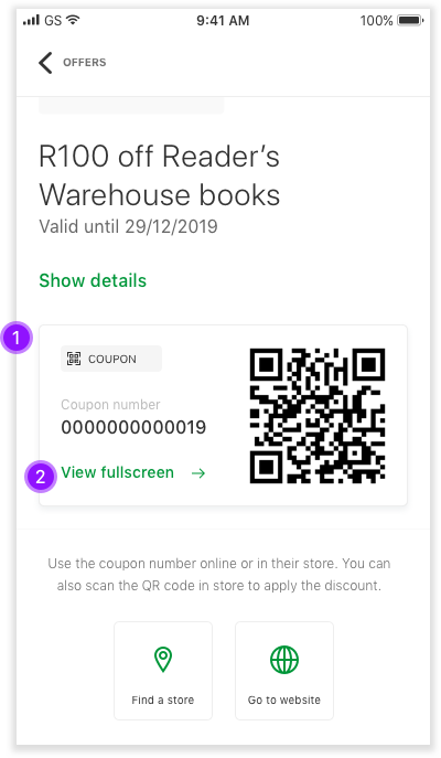 Allow customers to see what the coupon consists of, such as the coupon number and / or QR code. In some cases there is no coupon code, which is displayed in this section - see last screen #6.